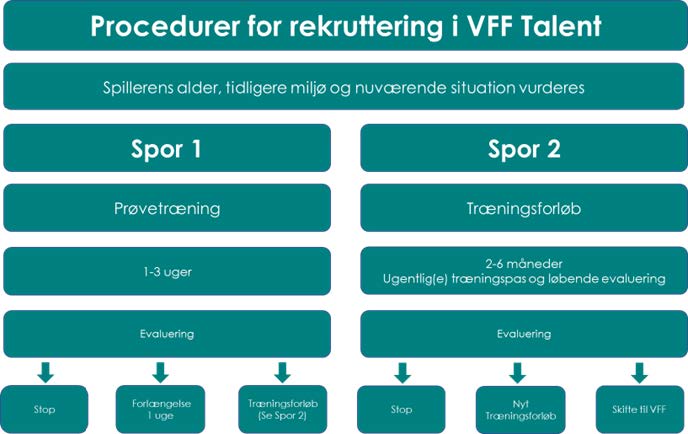 Det er vores ambition, at alle omkring VFF Akademi kender vores procedurer for rekruttering af spillere. Vi vil arbejde ordentligt og troværdigt i forbindelse med rekruttering af spillere og ønsker at leve op til kravene fra DBU om klubskifte. Derfor beskriver vi her vores rekrutteringsprocedurer: